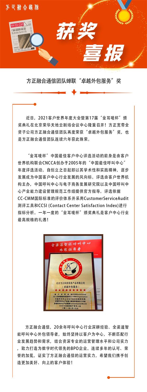 方正融合通信团队蝉联“卓越外包服务”奖